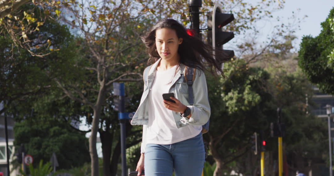 Young Asian woman walking through a city environment while holding a smartphone, dressed casually in jeans and a jacket. Urban setting with lush trees and a traffic signal visible. Depicts a modern lifestyle, travel enthusiast, or digital nomadic work style. Useful for illustrating themes of technology, city life, or active lifestyles.