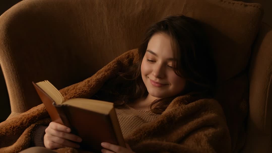 AI Generated Image. Showing Asian woman reading novel and smiling while reacting to passage, reclining in plush armchair and wrapping in soft brown blanket under warm ambient light. Capturing close-up emotion and intimate quiet moment, suiting lifestyle, wellness, and publishing projects. Working well for book club promos, publisher trailers, cozy home decor videos, social media reels about self-care and bedtime routines, blog headers about slow living and mindful leisure. Highlighting warm brown palette and soft textures, making footage ideal for mood-driven storytelling, background b-roll, hero banner, advertisement, or editorial feature.
