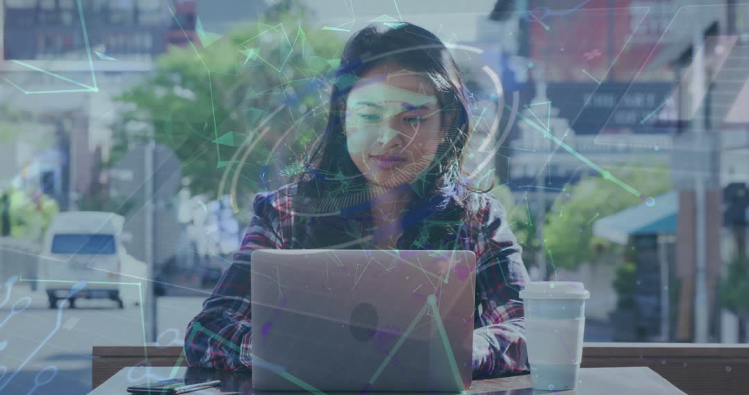 Image features an Asian woman with visuals of digital plexus graphics overlay on her using a laptop, while sitting at a cafe. Idea is conveyed of a futuristic or digital realm experience involving global networking and technology innovation. Perfect for use in discussions relating to advancements in business technologies, innovation connectivity, AI development, or urban coffee shop culture.