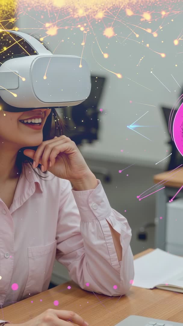 AI Generated Image. Vertical video showing Asian woman wearing VR headset and smiling while exploring glowing network visualization and particle overlays at office desk. Framing features close-up on face and hand with desk, laptop, and notebook visible in background, creating professional yet playful mood. Visual style combines realistic office elements with futuristic neon effects, suitable for short social clips and widescreen edits. Use for corporate technology presentations, VR and AR product demos, e-learning modules, training and onboarding videos, startup pitch decks, marketing for innovation labs, social media vertical ads, and website hero banners. Edit suggestions include looping particle animation for Instagram Stories, adding lower-third title and call-to-action, syncing overlays to voiceover, and using subtle color grading to match brand palette. Target audience includes technology companies, education providers, HR teams, creative agencies, and innovators promoting immersive tools and data-driven storytelling.