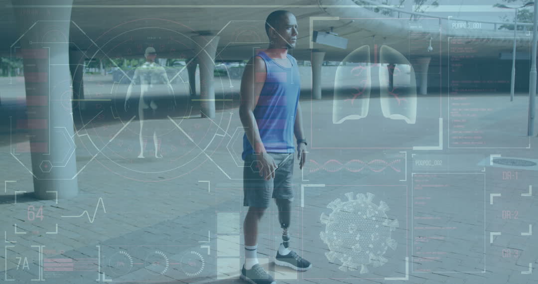 A biracial athlete with a prosthetic leg is improving fitness by engaging in a slow-motion squat workout in an urban setting. Technology overlays suggest an analytical or futuristic perspective on modern fitness and health. Could be used for promoting inclusivity in sports, wearable technology, or discussions on adaptive athletic disciplines.