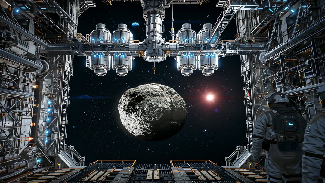 - Asteroid Observation from Docking Bay — Astronauts Monitoring Rocky Near-Earth Object