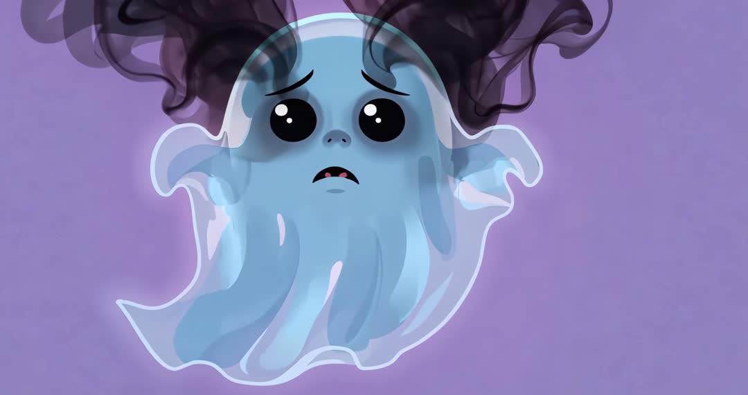 AI Generated Image. Animated sequence captures ghost-like creature with large expressive eyes showing surprise and anxiety against a soothing lavender backdrop. Shift from surprise to anxiety enhances dramatic effect, ethereal appearance accentuated by misty aura. Useful for projects related to animation, children's stories, or illustrating supernatural themes.