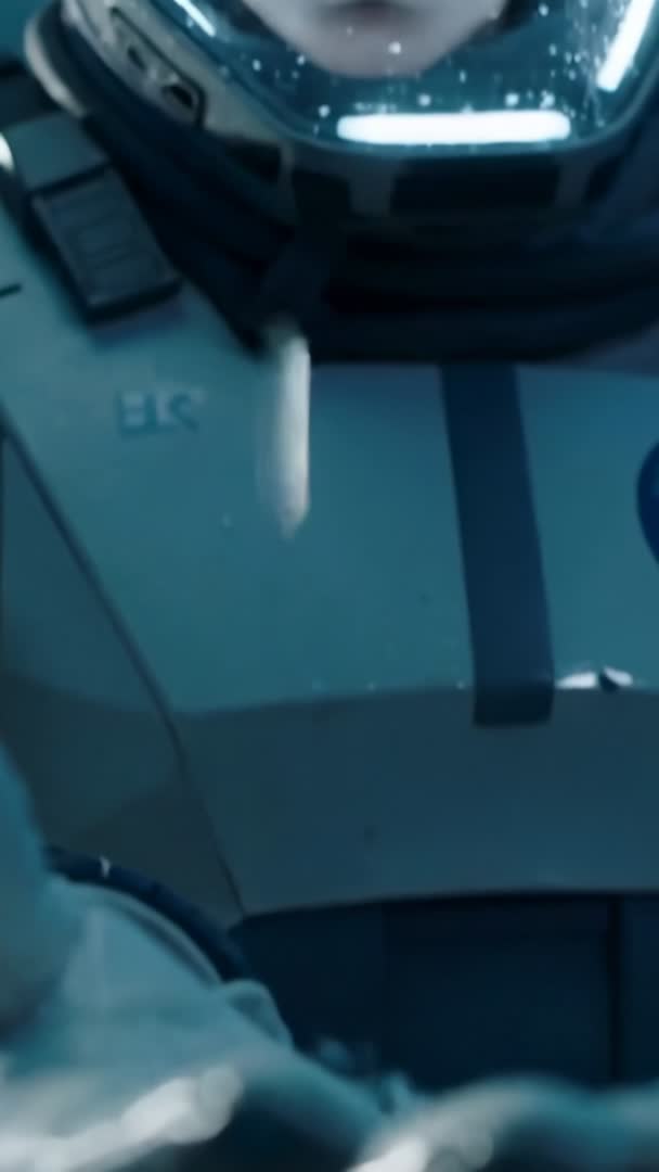 AI Generated Image. Vertical video showing close-up of suited astronaut catching ceiling drip with glove and inspecting visor leak in spacecraft module. Cool blue lighting and shallow depth of field creating cinematic, focused mood. Footage suiting documentary segments, safety training, aerospace marketing, and sci-fi promos. Clip working well as cutaway for leak investigation sequence, instructional training on water behavior in microgravity, or dramatic detail shot for feature edit. Recommend applying slow motion to emphasize droplet motion, subtle color grade to enhance cool tones, and tight crop for social media vertical format. Consider adding ambient mechanical sound and soft suspense score. Licensing suggested for commercial, editorial, and educational use across mobile platforms and broadcast.