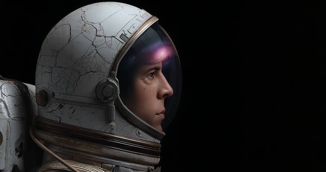 - Astronaut Gazing into Space Void with Futuristic Reflections