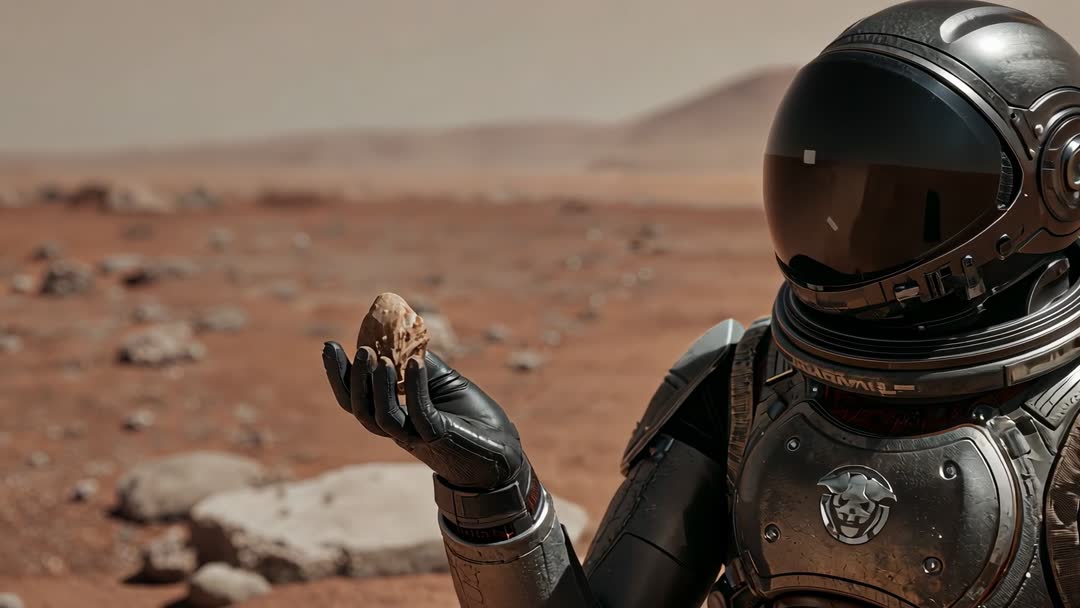 AI Generated Image. Video clip showing suited astronaut holding small brown rock on red rocky plain, rotating specimen for close inspection through reflective helmet visor. Close-up framing highlighting glove texture, suit plating, and visor reflections for cinematic realism. Wide shallow depth of field separating foreground subject from distant dunes and scattered stones. Color palette featuring warm desaturated red and ochre tones evoking Mars-like environment. Suitable for use in science education, space mission concept reels, documentary b-roll, sci-fi trailers, magazine covers, website hero banners, social media promos, and advertising campaigns about planetary exploration or geology. Ideal for illustrating sample collection, field analysis, astronaut training simulations, or speculative visual storytelling about extraterrestrial discovery. Licensing suggestions include editorial articles on Mars missions, promotional material for aerospace technology, backgrounds for voiceover narration, or overlay with animated graphics for data visualization.