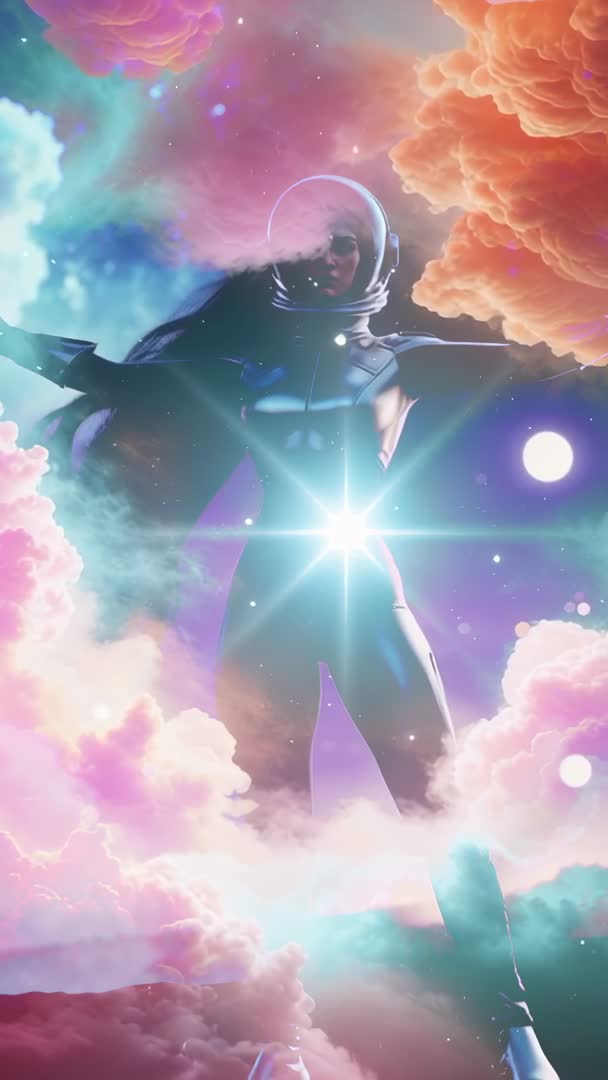 - Astronaut Spreading Arms Amid Vivid Nebula as Starburst Reveals Glowing Orb — Vertical Video