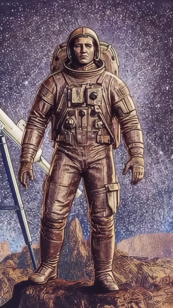 AI Generated Image. Video showing astronaut surveying alien terrain while standing on rugged planet surface with ladder support and star-filled sky. Vertical composition delivering phone-first cinematic feel and tall frame suitable for social reels, stories and mobile ads. Scene conveying exploration, discovery, solitude, heroic adventure and vintage-futuristic technology. Suiting sci-fi trailer, space documentary segment, educational clip about EVA operations, technology demonstration, museum exhibit intro, marketing for game or film. Color grading delivering dramatic contrast and textured backdrop while enhancing cinematic mood. Licensing matching editorial stories, commercial promos, online content and immersive installations.