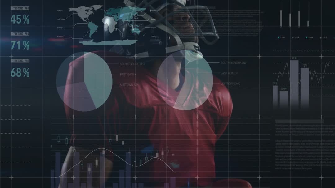Athlete adjusting football helmet with futuristic analytics and performance data visualization overlays, showing charts, graphs, and numerical statistics. Ideal for illustrating themes of sports analytics, performance improvement, data-driven training, and integration of technology in athletics.