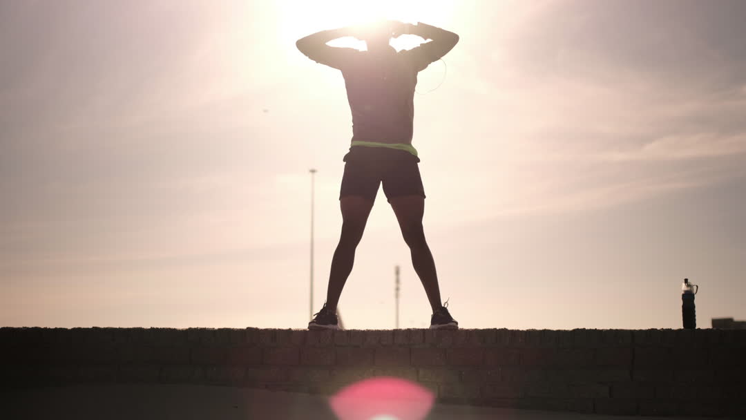 This video captures an athlete performing squats on a wall during a sunny evening, framed by the intense backlighting of the setting sun. The silhouette creates a dynamic and motivational scene, perfect for fitness advertisements, sports apparel promotions, or motivational health discussions. The focus on the muscular pose against the expansive sky and bright sunlight suggests themes of determination and physical strength for branding content in wellness and lifestyle campaigns.