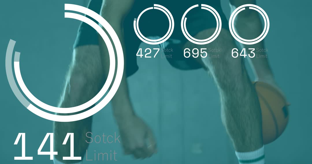Video showing close-up of athlete dribbling basketball on indoor court while HUD circular graphics and numeric counters are animating over legs and ball, conveying real-time performance analytics and fatigue tracking. Visual style combining teal color grade with translucent data rings is creating modern sports tech aesthetic ideal for on-screen overlays. Use for sports technology commercials, fitness app demos, coaching platform tutorials, broadcast graphics packages, training analysis videos, startup pitch decks, social media highlight reels, and website hero banners. Recommended editing notes: place brand logo upper right, adjust color tint to match brand palette, use seamless loop of 4-8 seconds for social media, and scale HUD elements for different aspect ratios. Deliverable ideas: short promo clip for wearable sensor product, background for analytics explainer, visual asset for strength and conditioning presentations, or overlay sample for broadcast scoreboard design.