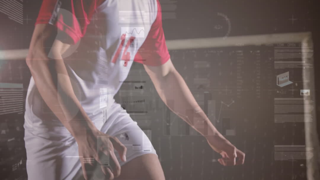 Focuses on interaction between athletic performance and technology with data visualizations. Useful for illustrating sports analytics, high-tech performance solutions, future of competitive sports.
