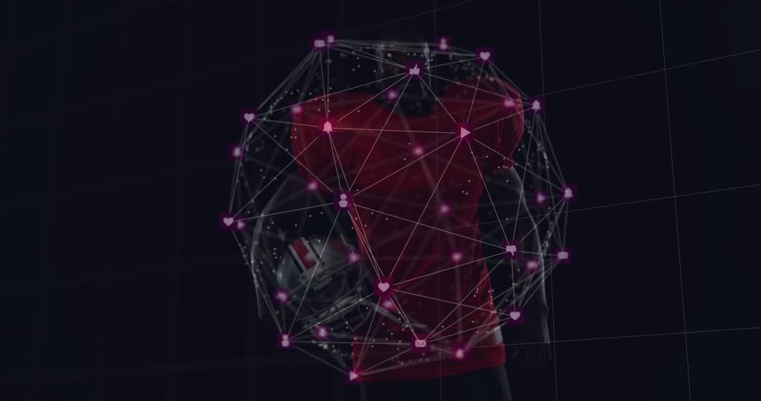 Featuring athlete holding helmet with holographic biometric network rotating around torso, nodes highlighting heart and user icons and forming interconnected sphere. Clip presenting futuristic sports technology concept with neon grid and subtle particle motion, ideal for creating high-energy visual impact. Recommended uses include broadcast openers, sports technology presentations, wearable tech demos, fitness app intros, training analytics videos, and promotional content for performance labs. Editing suggestions: loop network animation for background use, add headline text and lower third, match neon palette to brand colors, speed ramp node motion for dramatic reveal, and composite team logo or sponsor badges into grid. Deliverables: 4K loop for title sequences, vertical crop for social reels, and short cuts for ad spots and web hero banners.
