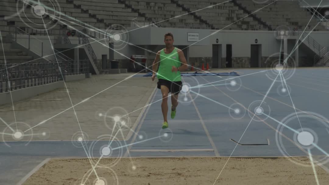 Athlete running on stadium track surrounded by animated network graphics representing digital connections and technological advancements in sports. Perfect for illustrating the intersection of athletics and technology, sports science, and fitness innovation content.