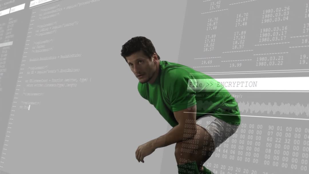 This video portrays a male athlete wearing sports gear in a high-tech environment with digital overlays of encryption and code. It conveys themes of focus, precision, and innovation by merging physical prowess with a backdrop of technological advancement. Ideal for illustrating topics related to the intersection of sports and technology, showcasing futuristic training methods, or emphasizing the importance of cybersecurity in modern data-related fields.