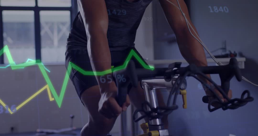 Expression of athlete exercising on stationary bike while data graphs overlay, highlighting fitness analysis and performance tracking. Ideal for illustrating concepts of training, sports science, or health measurement.