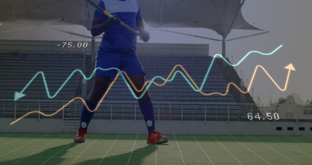 The scene features an athlete executing a stick swing on a sports field as animated performance graphs display key data. This video highlights the intersection of sports and technology, emphasizing motion analysis and biomechanics. Perfect for content related to athletic training, sports science education, and improving player performance using data-driven insights.