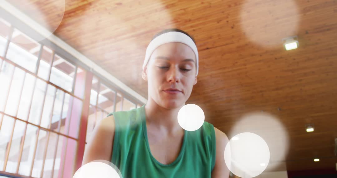 Video shows female athlete in basketball arena preparing to take free throw. Light orbs drift around, creating motivational and focused atmosphere. Ideal for sports-related media like training aids, motivational videos for athletes, or sports brand advertisements showcasing determination and performance.