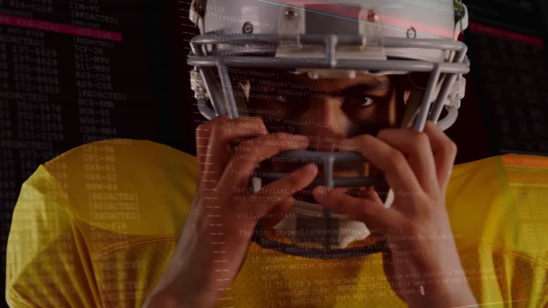 A male athlete adjusting helmet in preparation for a game featuring a transparent technology overlay, suggesting innovation in sports gear and strategy. Use video for themes of sport advancement, game strategies in sports marketing, motivational content, highlighting technology integration in sports.