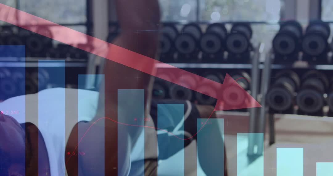 Showing athlete pressing dumbbell on bench while digital bar chart and red downward arrow tracking falling performance metrics. Featuring weight rack background, dynamic motion blur, cool blue tone, and semi-transparent data overlay for high-tech look. Suggesting themes of workout plateau, strength loss, training analytics, gym business trends, and health monitoring. Use for fitness articles, performance reports, sports science presentations, gym marketing videos, app dashboards, online coaching modules, and social media ads. Offering editing ideas: add animated chart lines, voiceover narration, on-screen captions, lower third call to action, and close-up cutaways for pacing. Keeping branding cohesive with overlay color matching and cropping for 16:9 or vertical social formats.
