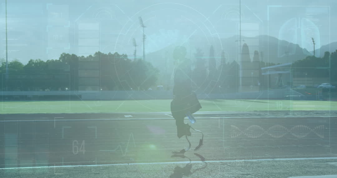 The video depicts an athlete with prosthetic legs running on a track, overlaid with digital data and technological graphics. This representation highlights the intersection of sports, medicine, and modern technology, emphasizing the capabilities and determination of athletes with disabilities. Useful for promoting innovation in sports technology, disability awareness, and the integration of data in athletics.