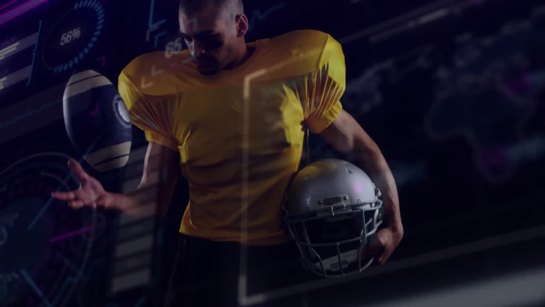 Male athlete dressed in yellow gear engaging with a digital interface while holding a helmet and spinning a high-tech device representing cohesion between sport and technology analytics. Conveying themes of innovation and advanced performance metrics, this visually striking video serves well in illustrating modern advancements in sports science, promotional content for sports technology, educational outlets on athletic performance, or visual aids in tech workshops.