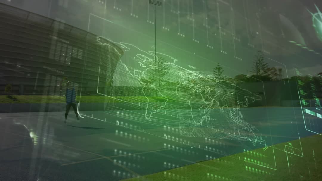 Video captures athlete showcasing agility and speed on court while overlay of holographic map powers data insights. Blends future sports and digital technology, highlighting potential of integrating analytics with performance tracking. Ideal for sports tech presentations, dynamic innovation showcases, and futuristic motion projects.