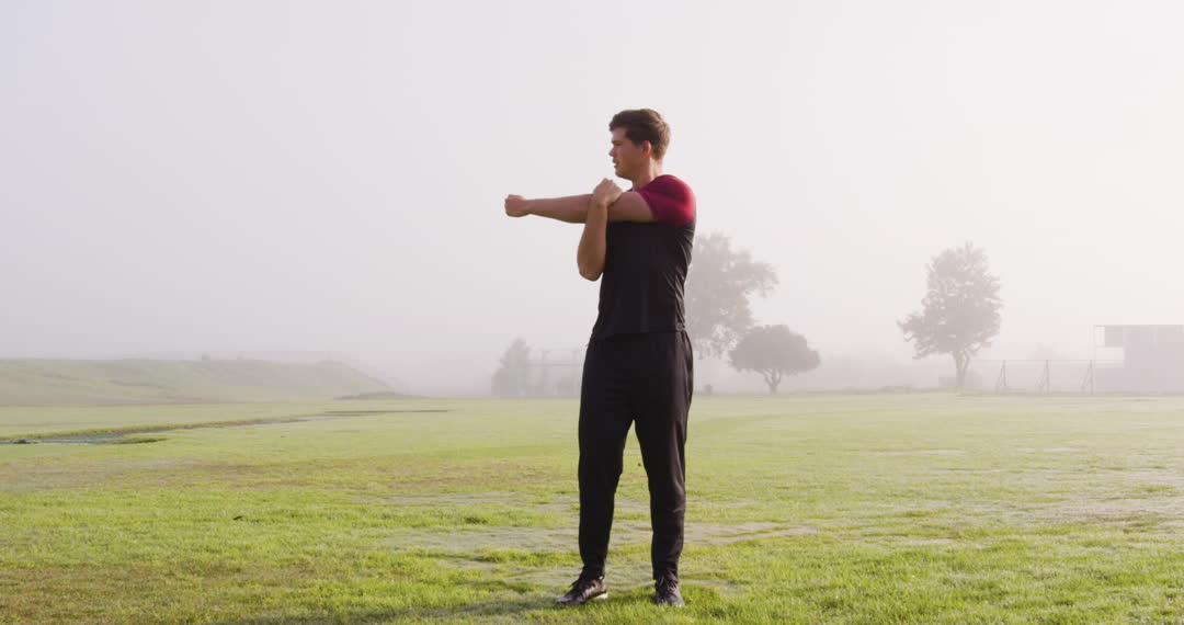 Athlete Stretching on Misty Field for Morning Practice Video
