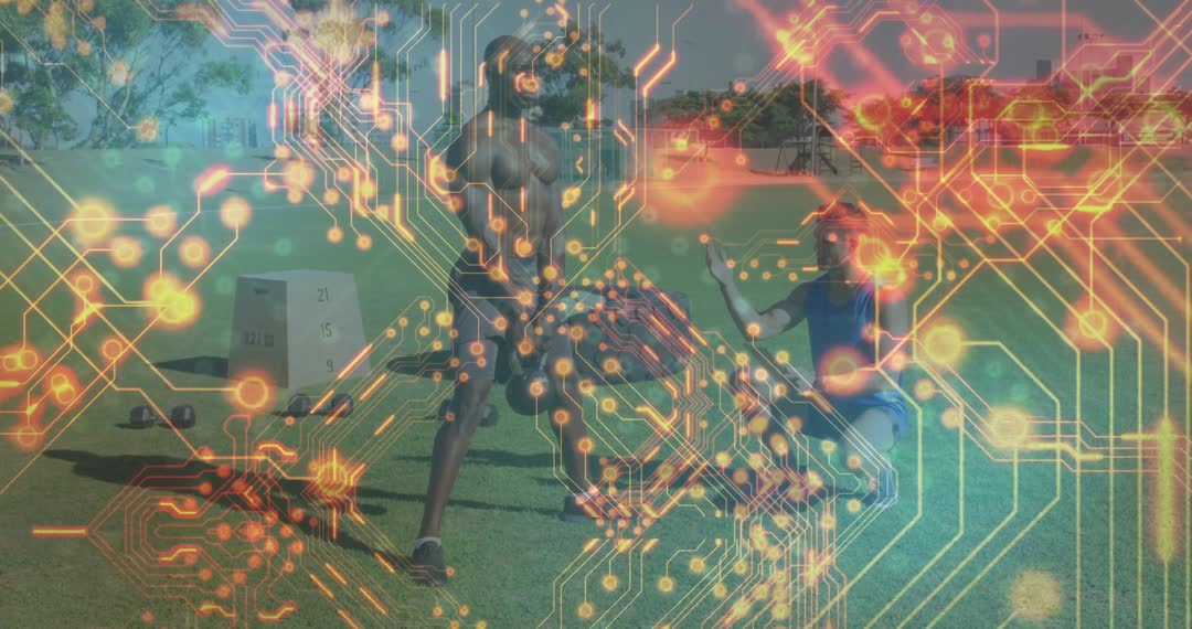 This video depicts an athlete engaged in a kettlebell workout on a grassy outdoor field. The coach provides guidance, focusing on form and technique to optimize strength gains. The layered graphics imply a combination of physical effort and digital enhancement, suggesting technology's role in fitness innovation. Ideal for use in fitness websites, training programs, and digital health platforms to emphasize the intersection of athletics and technology.