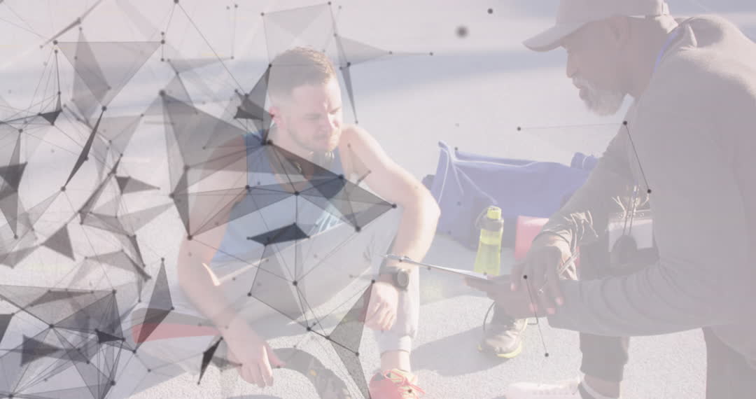 A professional runner engages in training with a dedicated coach, focused on athletic development. The digital overlay suggests technological integration, adding a futuristic and analytical aspect to sports training. Ideal for use in content focusing on sports coaching, innovations in sports technology, or teamwork in athletics.