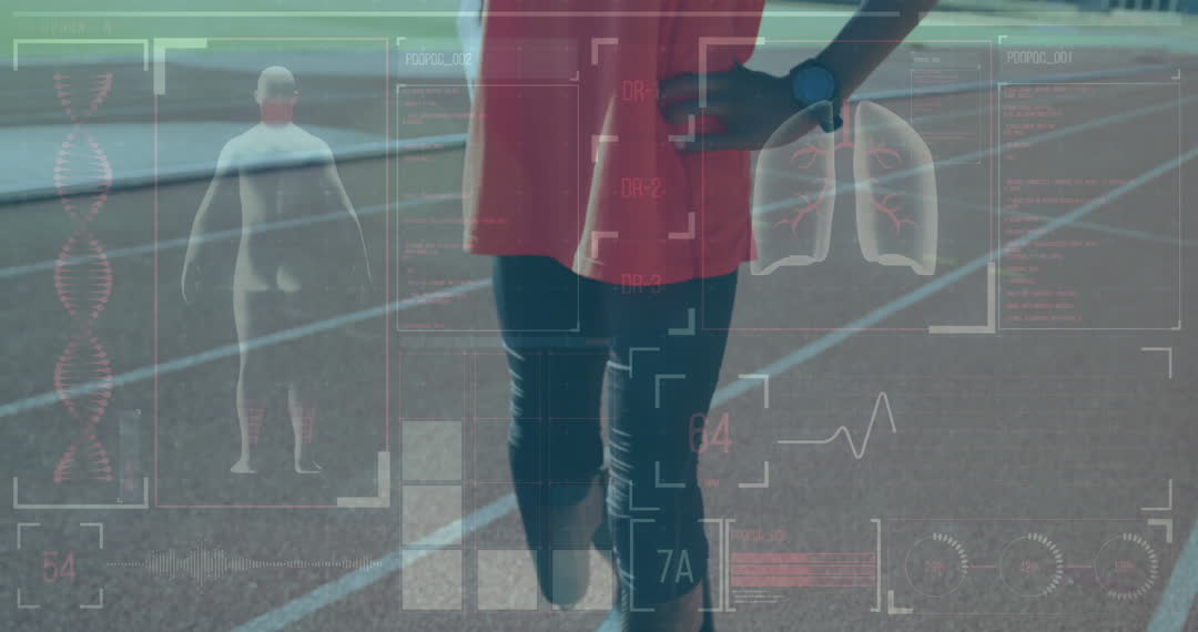 This depicts an athlete at a running track with overlaid health monitoring animations. Ideal for illustrating topics related to sports technology, athlete performance tracking, biometric data usage, and innovations in fitness monitoring. Useful for articles, blogs, or presentations focused on enhancing athletic performance with digital tools.