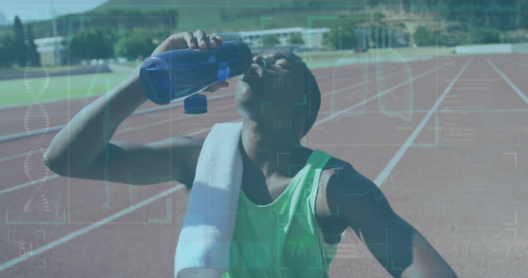 Disabled athlete with prosthetic legs is sitting on a race track, quenching thirst by drinking water. Futuristic overlay of digitally generated medical analytics adds a technological aspect. Ideal for advertising health gadgets, digital health monitoring applications, motivation in sports, or coverage on inclusivity in athletics.