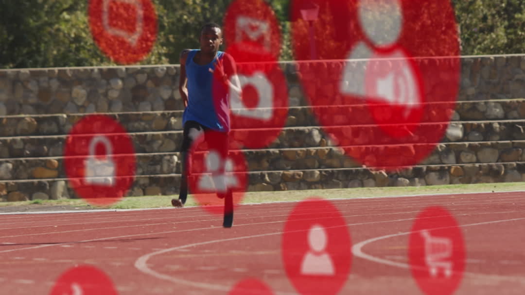 Athlete with Prosthetic Legs Sprinting on Track with Digital Icons Video