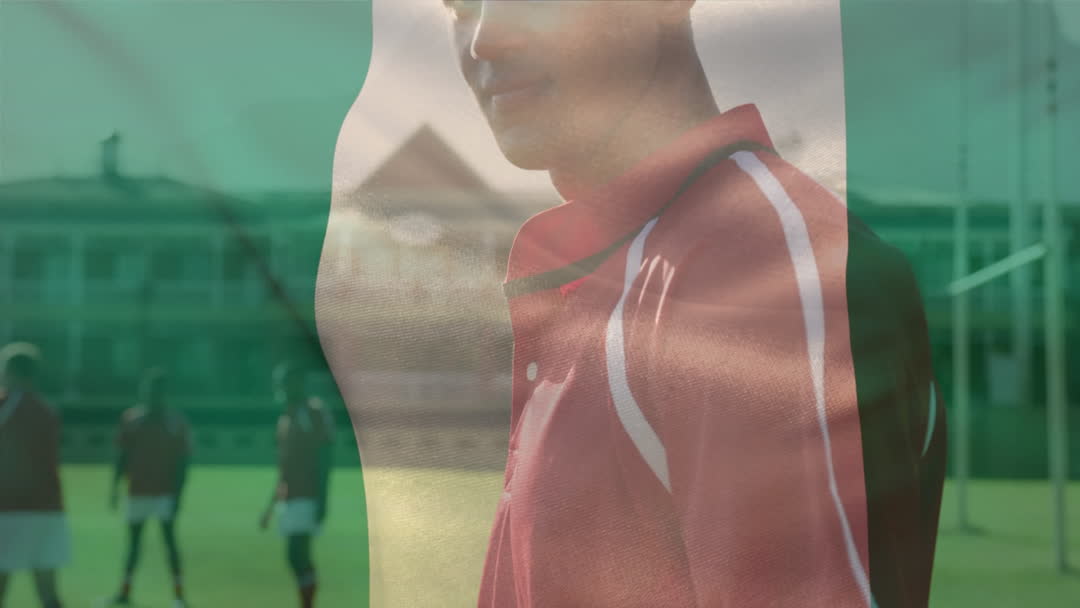 Image captures male athlete on rugby field with flag overlay effect, symbolizing sportsmanship and national pride. Other players in background, highlighting teamwork. Ideal for sports magazines, promotional sports events, and athletic fundraisers.