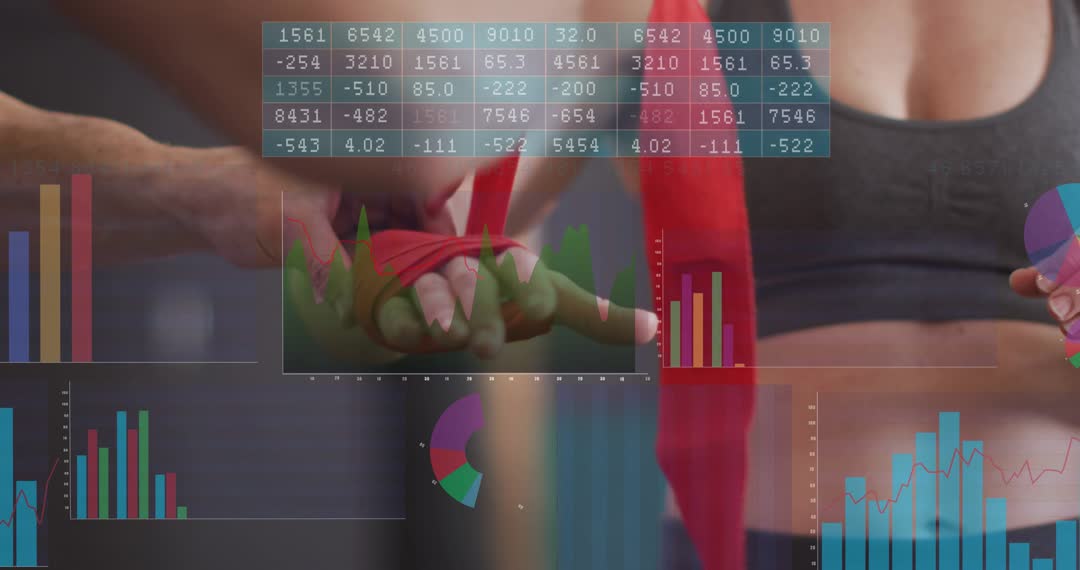 Close-up video showing athlete extending hand while coach wrapping wrist with bright red hand wrap, overlaid with translucent bar charts, line graphs and pie charts representing performance metrics and analytics. Composition featuring torso and hands in shallow depth of field, charts floating across frame and blending with movement to convey real-time monitoring and training insight. Suited for sports technology demos, coaching tutorials, boxing and fitness brand campaigns, wearable analytics presentations, injury-prevention and physiotherapy content. Use as intro clip for training apps, background visual for fitness websites, overlay for social media ads, or editorial footage for articles about performance measurement, coaching technique, and athlete preparation.