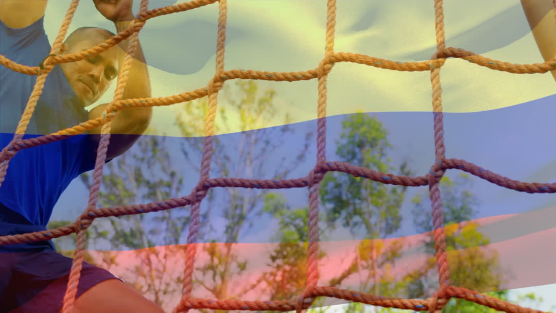 Athletes Climbing Obstacle Net with Colombian Flag Overlay Video