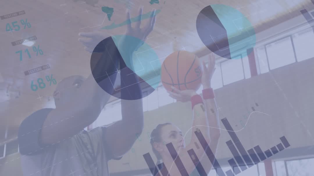 Two athletes practice basketball in a gym, focusing on teamwork and competitive performance. Translucent charts and graphs overlay, suggesting advanced performance analytics and predictive sports technology. Useful for articles or content about sports science, technology in athletics, or training methodology.