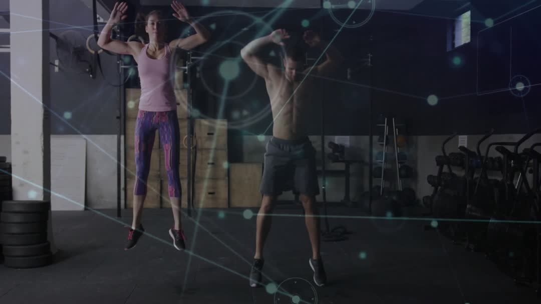 A man and woman perform synchronized burpees in a modern gym environment, enhanced with digital graphic overlays, representing artistic technology fusion.illustrates teamwork, motivation, intense exercise, and modern fitness. Perfect for uses related to high-tech gym facilities, virtual gaming workouts, athlete training programs, synergy in training, health apps, and sports blog visuals landscapes.