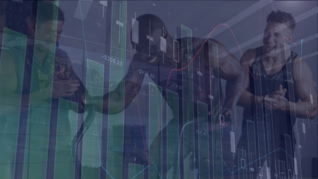 Group of athletes training vigorously at a gym with overlay of digital data graphics represents integration of technology and sports analytics in training regimes. Inspirational concept for sports technology features, fitness and performance analysis advertisements, or gym promotional materials.