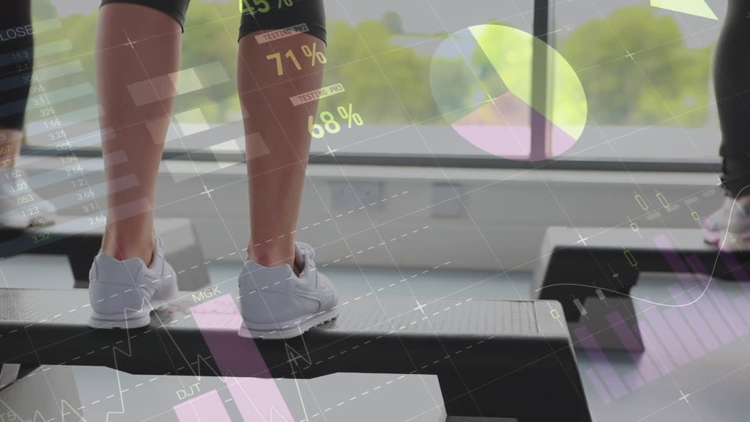 This scene creatively combines elements of business data analytics and physical fitness. The data graphics superimposed on an athletic backdrop illustrate a conceptual intersection of health and technology. Suitable for content about sports analytics, business strategies in fitness, and technology in health sectors.