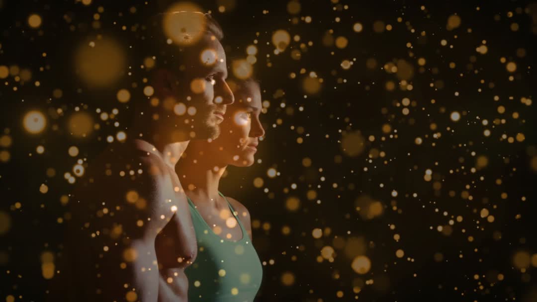 Frame showing athletic man and woman posed in side profile while warm golden bokeh floats across foreground, creating cinematic glow and layered depth. Studio lighting revealing facial contours and shoulder silhouettes for moody, high-contrast look. Featuring shallow depth of field, narrow profile composition, wide negative space on right for copy placement. Ideal for fitness brand promos, gym campaign openers, wellness website hero clips, social media reels, motivational training videos, product launches, event intros. Usage suggestions: using as looping background for title sequences, applying text overlays and lower-thirds, blending with workout montage, extracting stills for posters and banners, employing as texture layer to add shimmer to motion graphics and promotional reels.