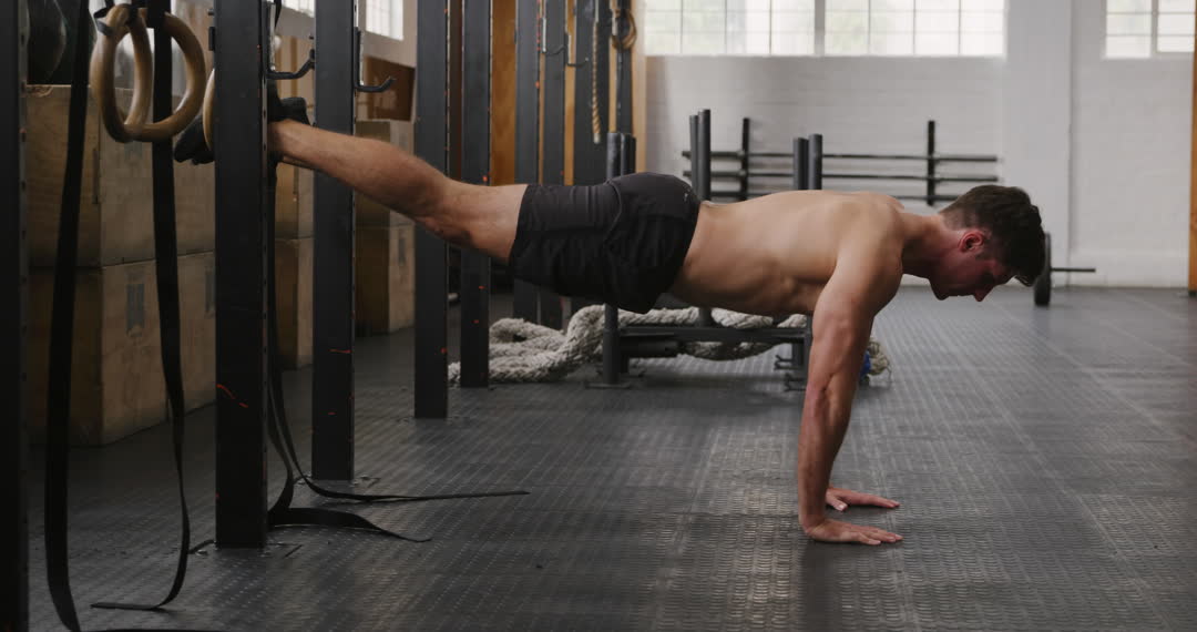 Shirtless athletic man executes an elevated push-up utilizing gymnastic rings in a cross-training gym. Ideal for articles on advanced workout routines, fitness programs, or strength training tips. Can be used in blogs, fitness apps, or instructional videos to illustrate effective bodyweight exercises.