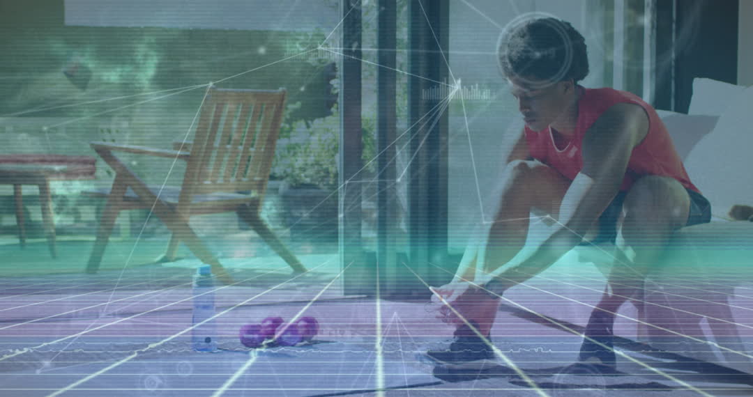 This video depicts a man in athletic attire tying his shoes, enhanced by a digital interface overlay displaying networks of connections. Represents the integration of technology and modern-day fitness practices. Ideal for illustrating concepts related to digital health, smart training technologies, and the intersection of fitness and tech industries in promotional materials and innovative product ads.