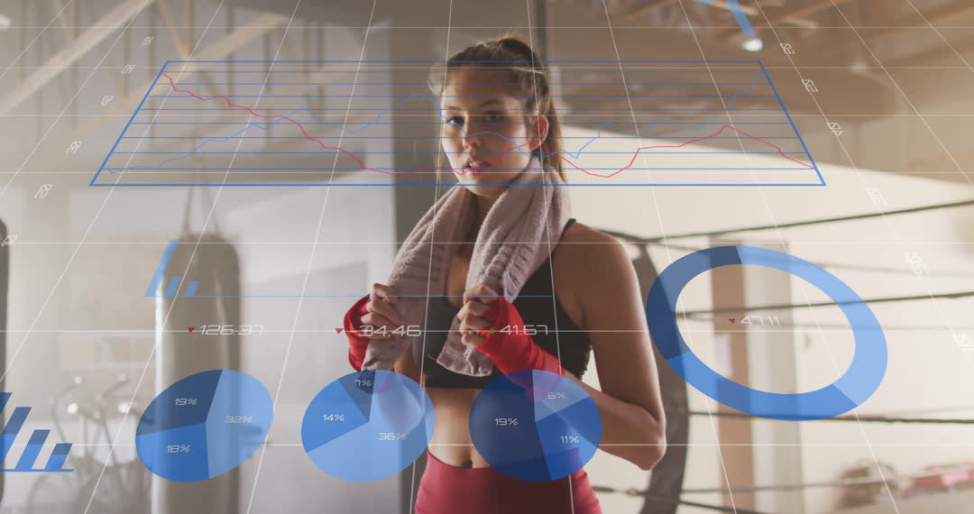 Depicts woman in gym environment with digital fitness graphs. Red wrappings suggest boxing training, merged with technology trends. Suitable for health blogs, fitness applications, technology ads focused on health tech.