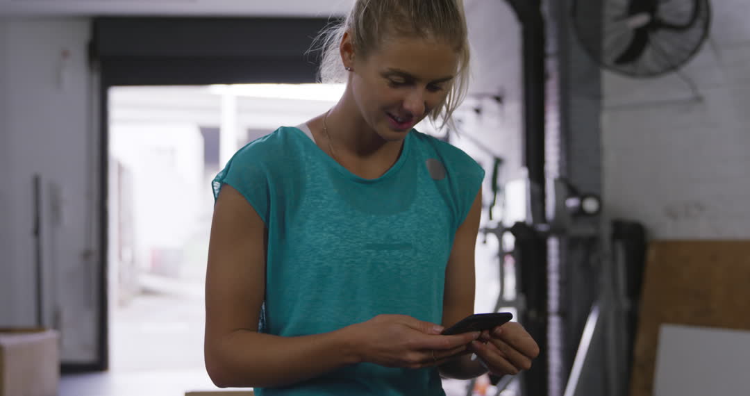 Female athlete smiling while checking her smartphone during a workout break in a gym setting. She engages in cross-training workouts, wearing suitable sports clothing. Gym equipment can be seen in the background, representing an active lifestyle, technology interaction, and modern fitness culture. Suitable for content related to fitness lifestyles, gym motivation, health apps, and workout routines.