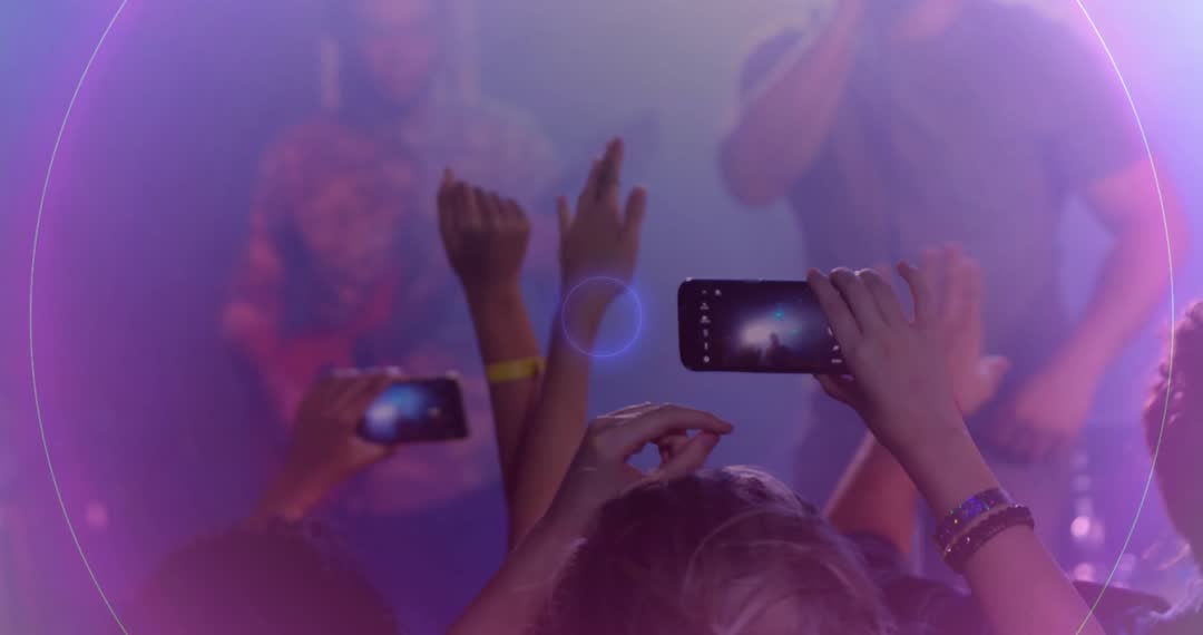 Shows enthusiastic crowd at concert capturing the live music performance using smartphones. With pulsating lights and vibrant energy, this video emphasizes immersive engagement during live music events. Ideal for use in articles about modern concert experiences, promotional materials for music festivals, and content on technology's role in entertainment.