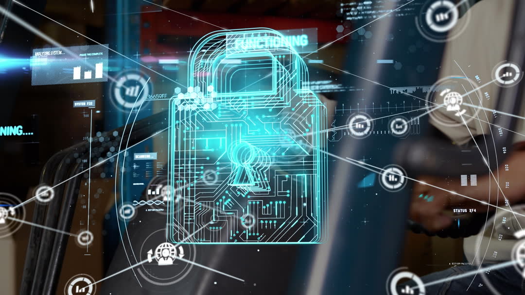Digital visualization show cyber security concept integrating with real-world application. Futuristic digital lock overlays network icons and graphs. Ideal for illustrating concepts of technology integration in industries like logistics and transportation. Useful for articles or presentations on cyber security in the operational technology sector.
