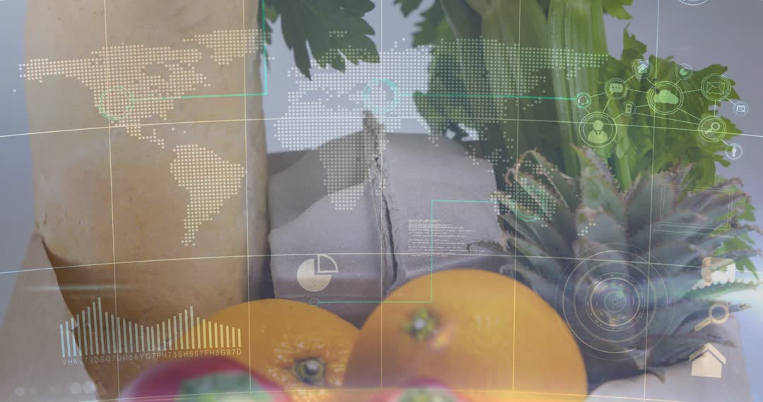 Augmented HUD Showing Global Supply Data Overlaying Fresh Citrus and Pineapple on Tabletop Video