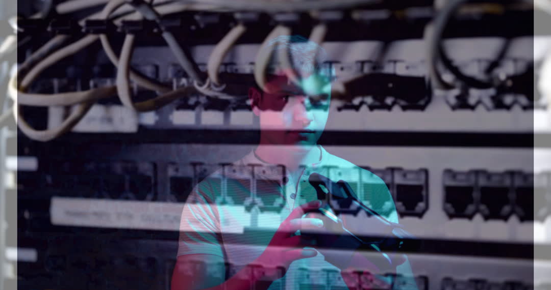 Image depicts a person using a VR headset in sync with a server room, symbolizing advanced technology intersection in global networking. Useful in articles or presentations about the future of technology, innovations in data centers, virtualization, or networking solutions.