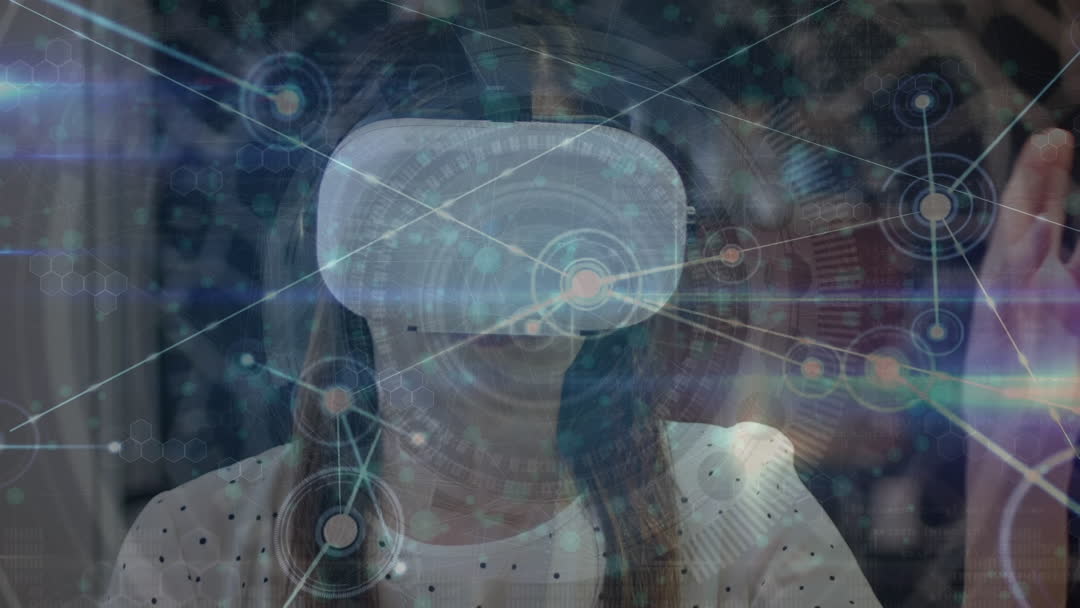 Scene features a caucasian woman engaging with immersive augmented reality using a VR headset. Geometric designs and digital connections add a futuristic concept, exploring technology integration. Ideal for depicting innovation in digital interfaces, virtual environments, or marketing technological advancements.